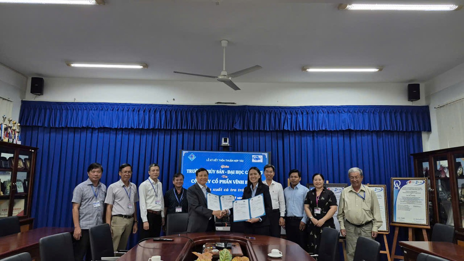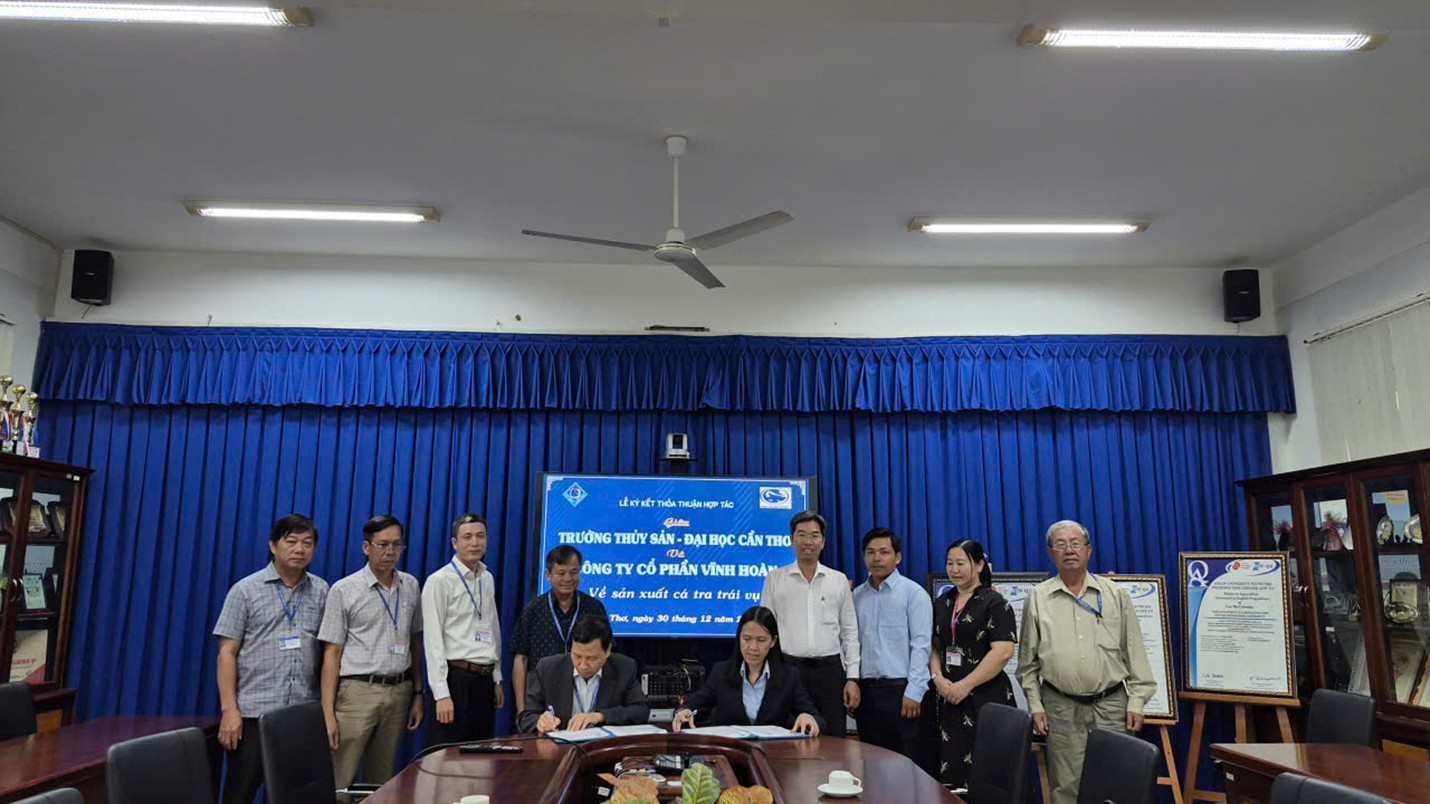 Chiều ngày 30/12/2025 Trường Thủy sản – Trường Đại học Cần Thơ đã có buổi làm việc và ký kết thoản thuận hợp tác với Công ty Cổ phần Vĩnh Hoàn về “Sản xuất giống cá tra trái vụ. Về phía Trường Thủy sản, GS.TS. Vũ Ngọc Út, Hiệu Trưởng cùng các thành cùng với Ban Giám hiệu Trường Thủy sản và lãnh đạo Khoa Công nghệ Nuôi trồng thủy sản, Trường Thủy sản. Về phía Công ty CP Vĩnh Hoàn có Bà Hồ Thanh Huệ, Giám đốc Sản xuất; Ông Nguyễn Quang Vinh, Phó Giám đốc sản xuất và lãnh đạo vùng nuôi tham dự.