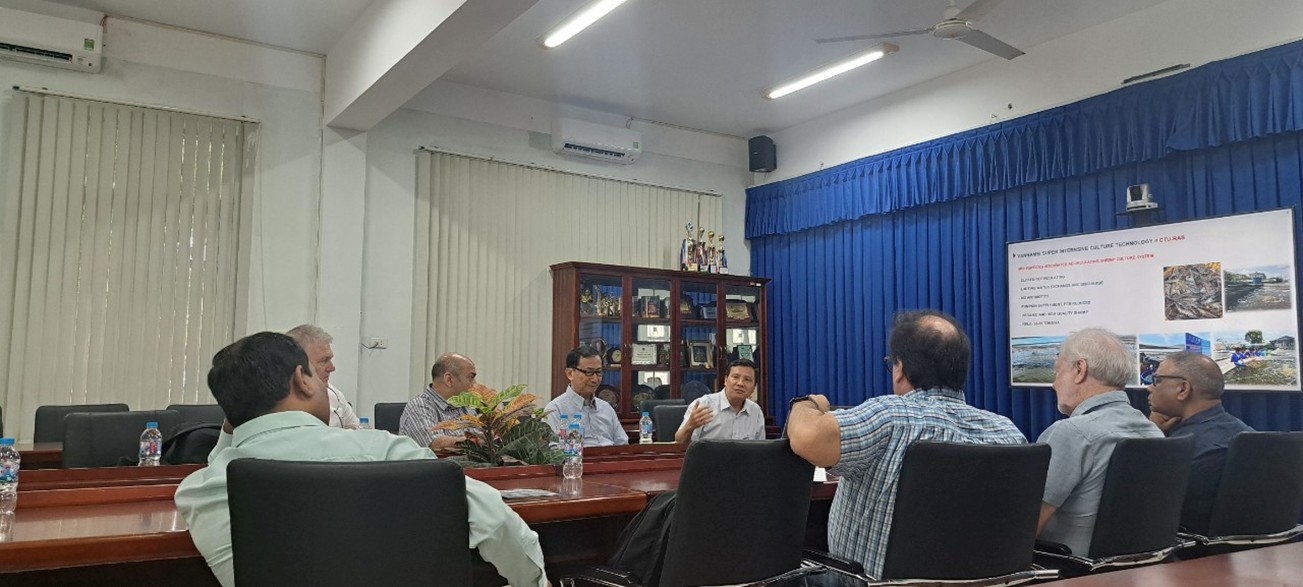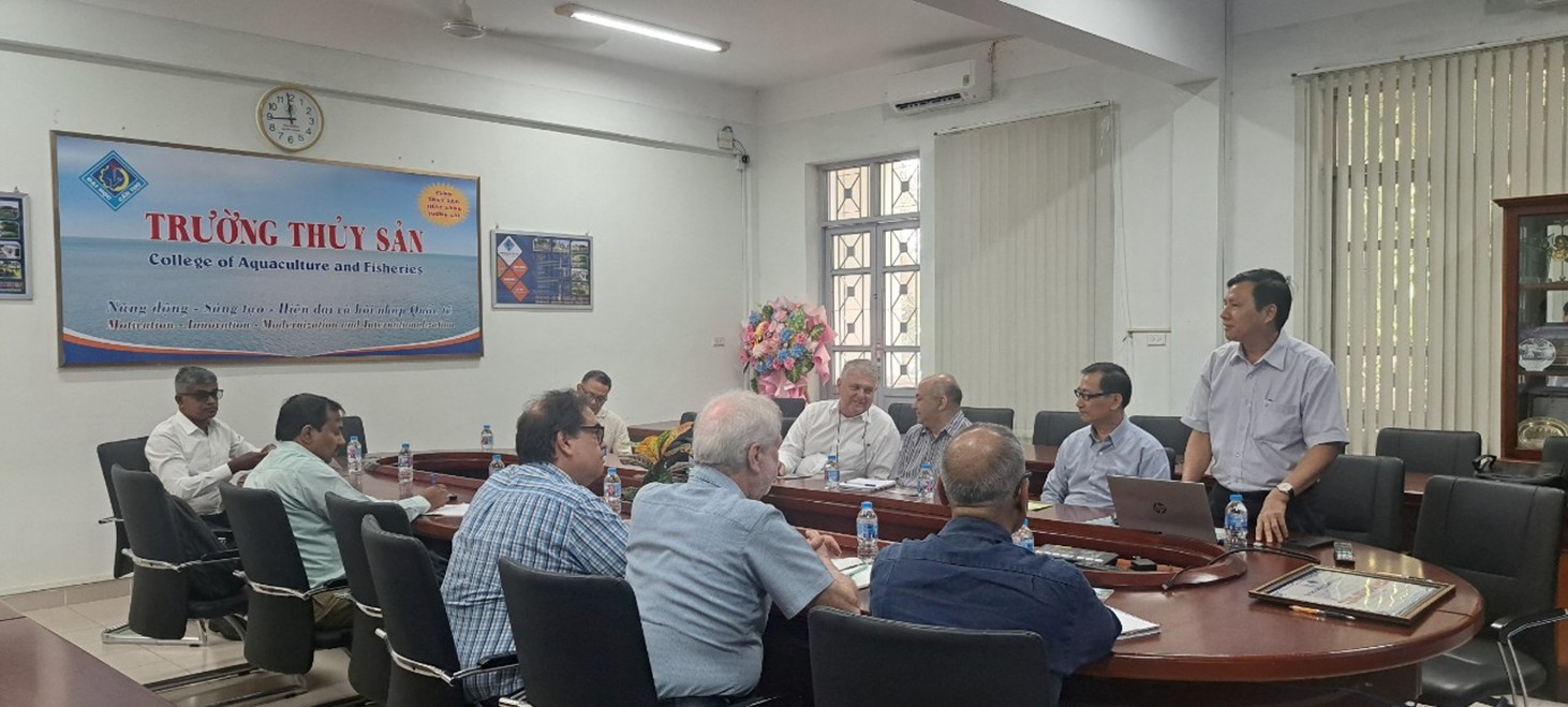 Dại diện Trường Thủy sản, GS.TS. Vũ Ngọc Út đã tiếp đoàn và giới thiệu các hoạt động đào tạo và nghiên cứu khoa học, nhất là những thành tựu nghiên cứu khoa học của Trường đã được phát triển và ứng dụng trong sản xuất ở Đồng bằng sông Cửu Long. Đoàn rất ấn tượng với các kết quả, thành tựu đạt được của Trường Thủy sản nhất là các mô hình nuôi thủy sản bền vững, thân thiện với môi trường như CTU-RAS, nuôi kết hợp tôm-rong, thủy canh kết hợp, nuôi thức ăn tự nhiên theo mô hình kinh tế tuần hoàn…..
