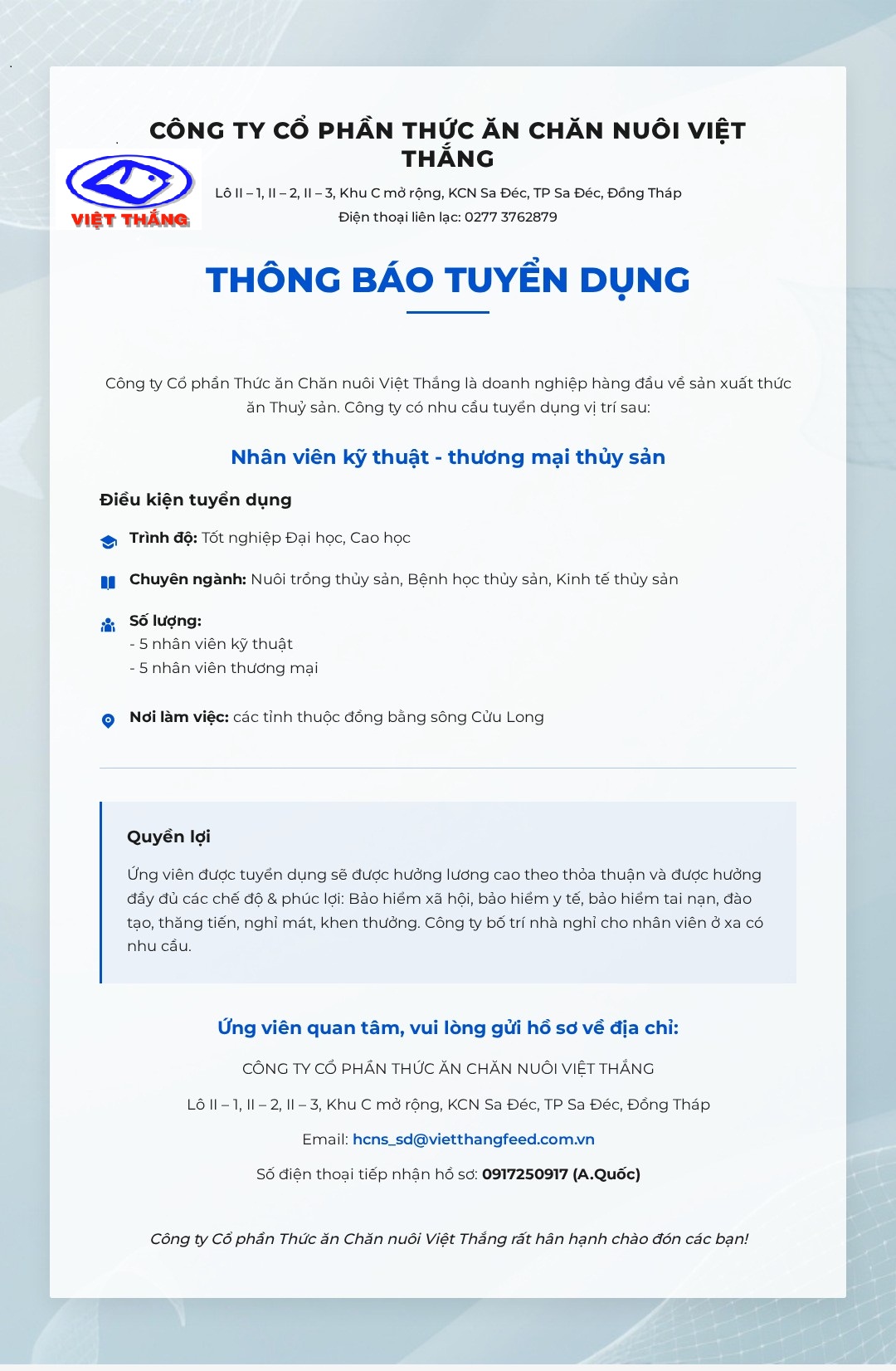 Công ty Cổ phần Thức ăn Chăn nuôi Việt Thắng là doanh nghiệp hàng đầu trong lĩnh vực sản xuất thức ăn thủy sản. Hiện nay, công ty có nhu cầu tuyển dụng vị trí sau: