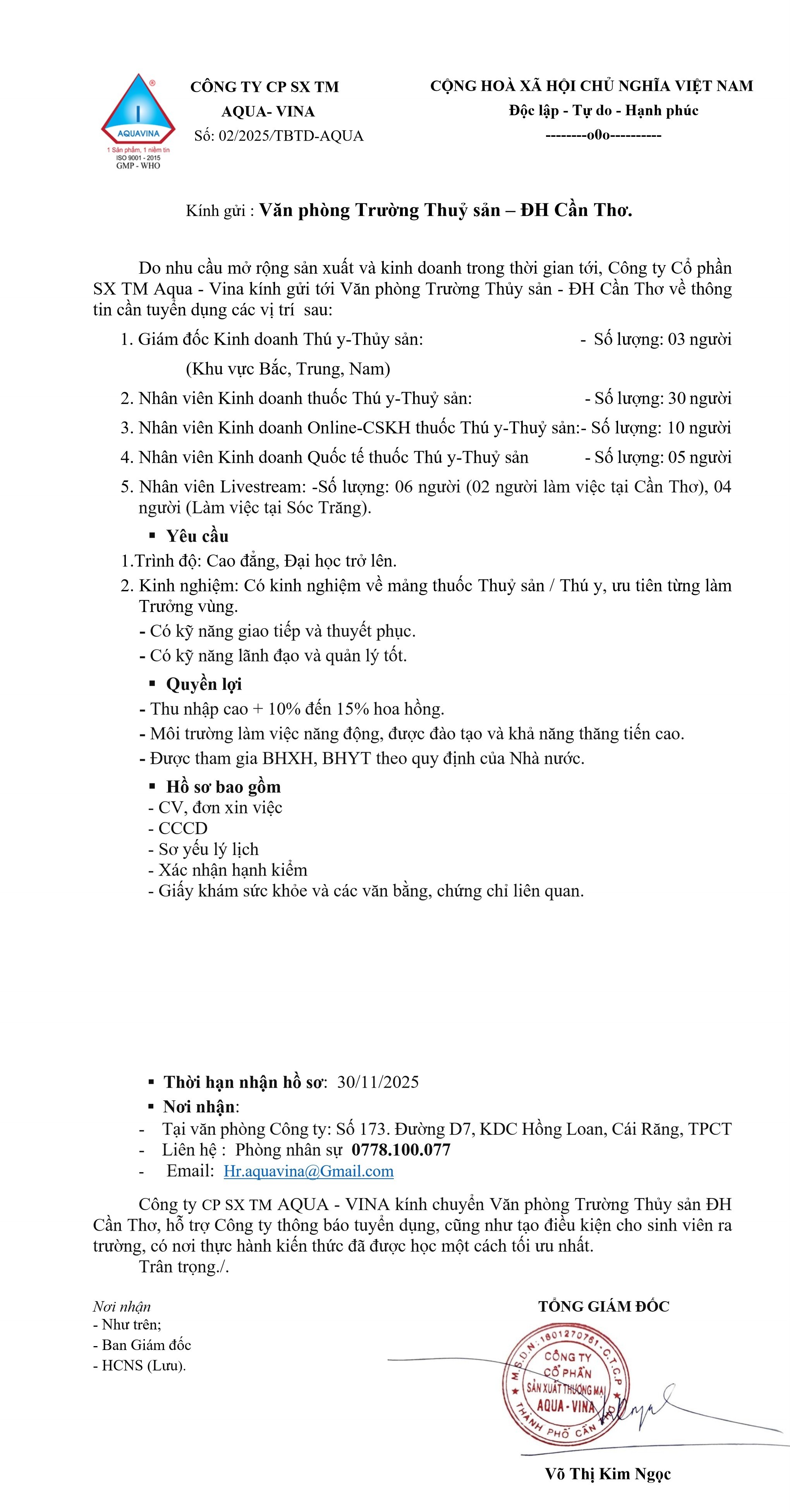 Do nhu cầu mở rộng sản xuất và kinh doanh, Công ty CP SX TM AQUA-VINA thông báo tuyển dụng các vị trí sau: