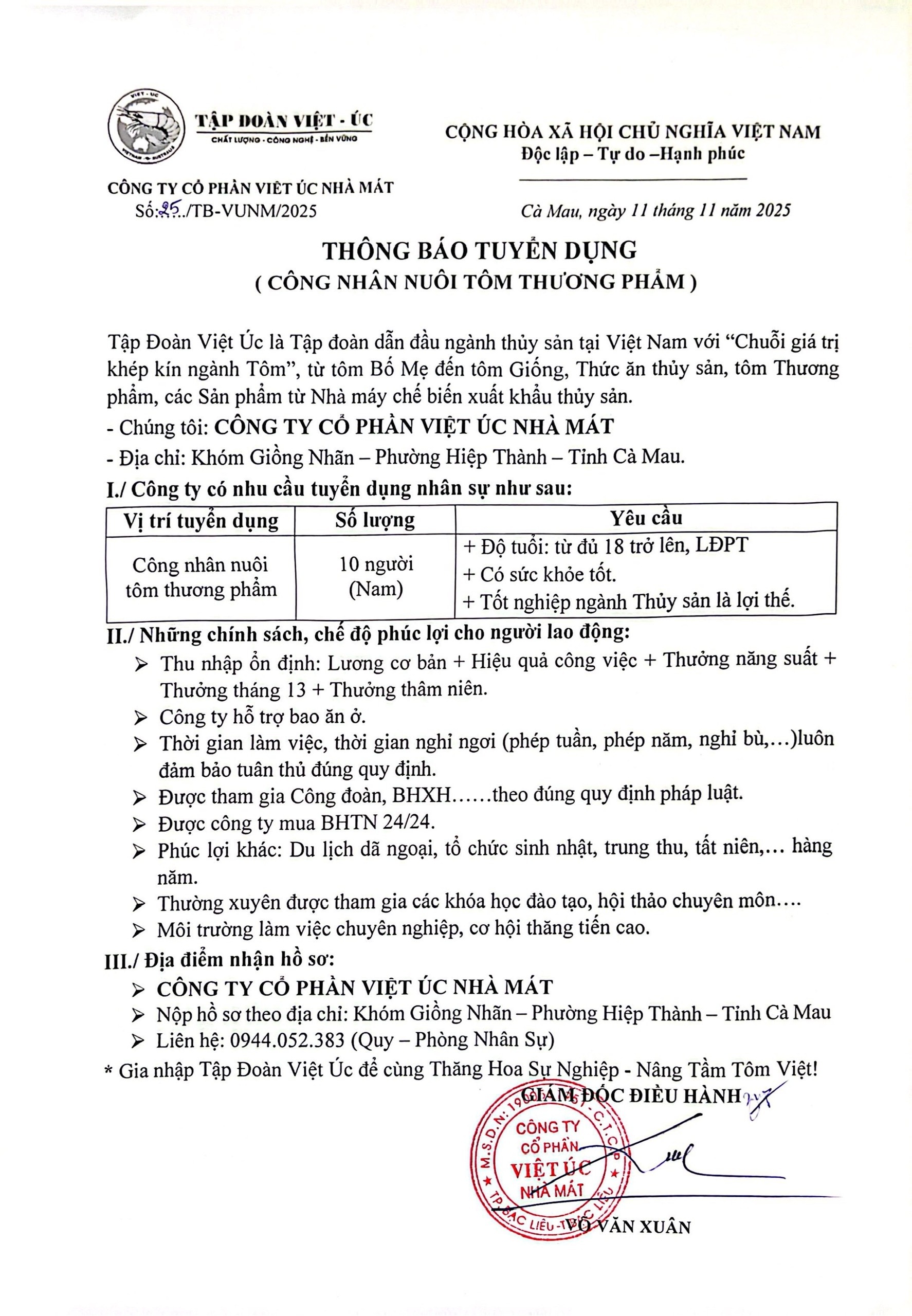 Công ty Cổ phần Việt Úc Nhà Mát (thuộc Tập đoàn Việt Úc – đơn vị hàng đầu trong lĩnh vực thủy sản tại Việt Nam) hiện đang cần tuyển dụng nhân sự làm việc tại khu vực Cà Mau, cụ thể như sau: