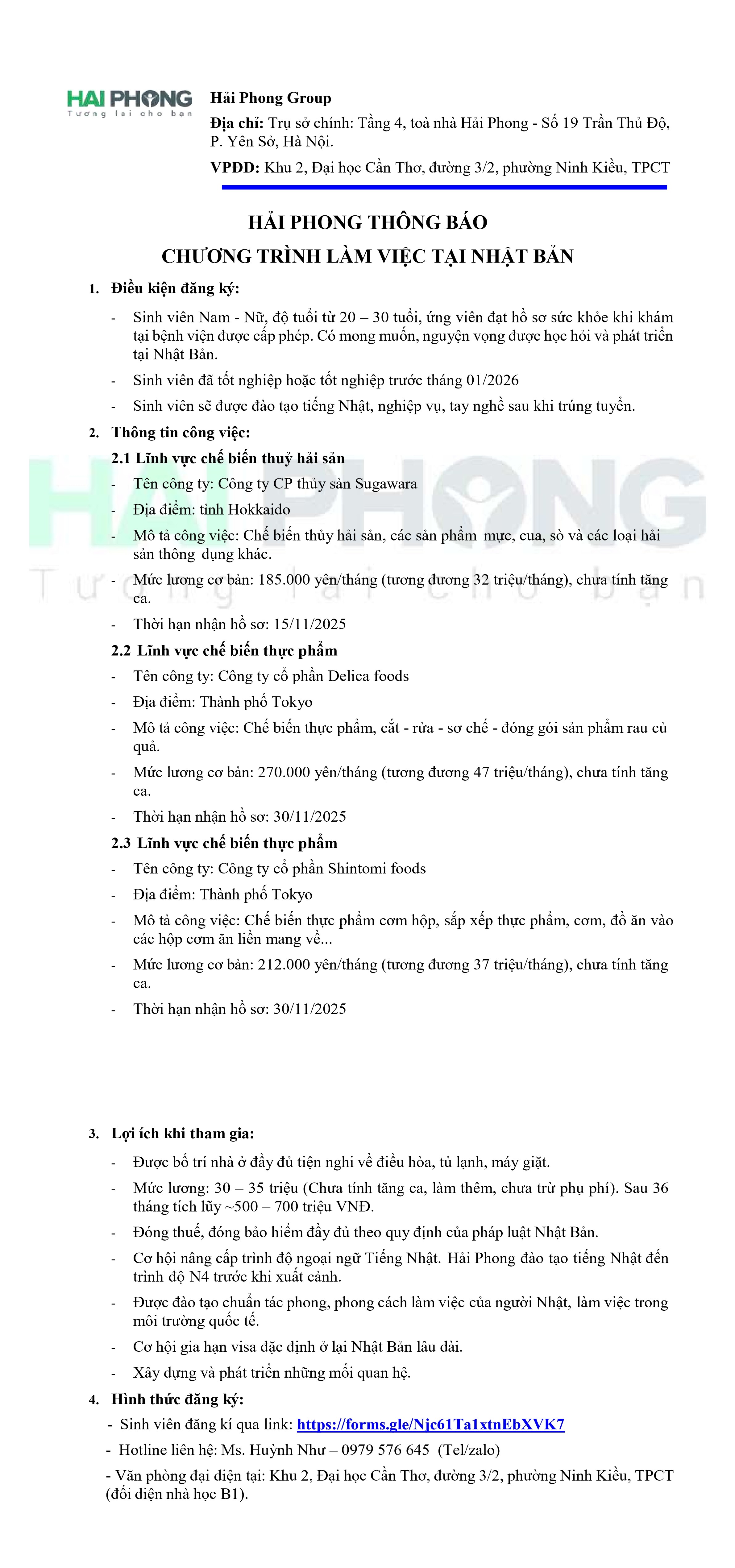 Công ty TNHH MTV Đầu tư Thương mại và Xây dựng Hải Phong thông báo tuyển dụng chương trình làm việc tại Nhật Bản dành cho sinh viên và người lao động trẻ có mong muốn học hỏi, phát triển bản thân trong môi trường quốc tế.