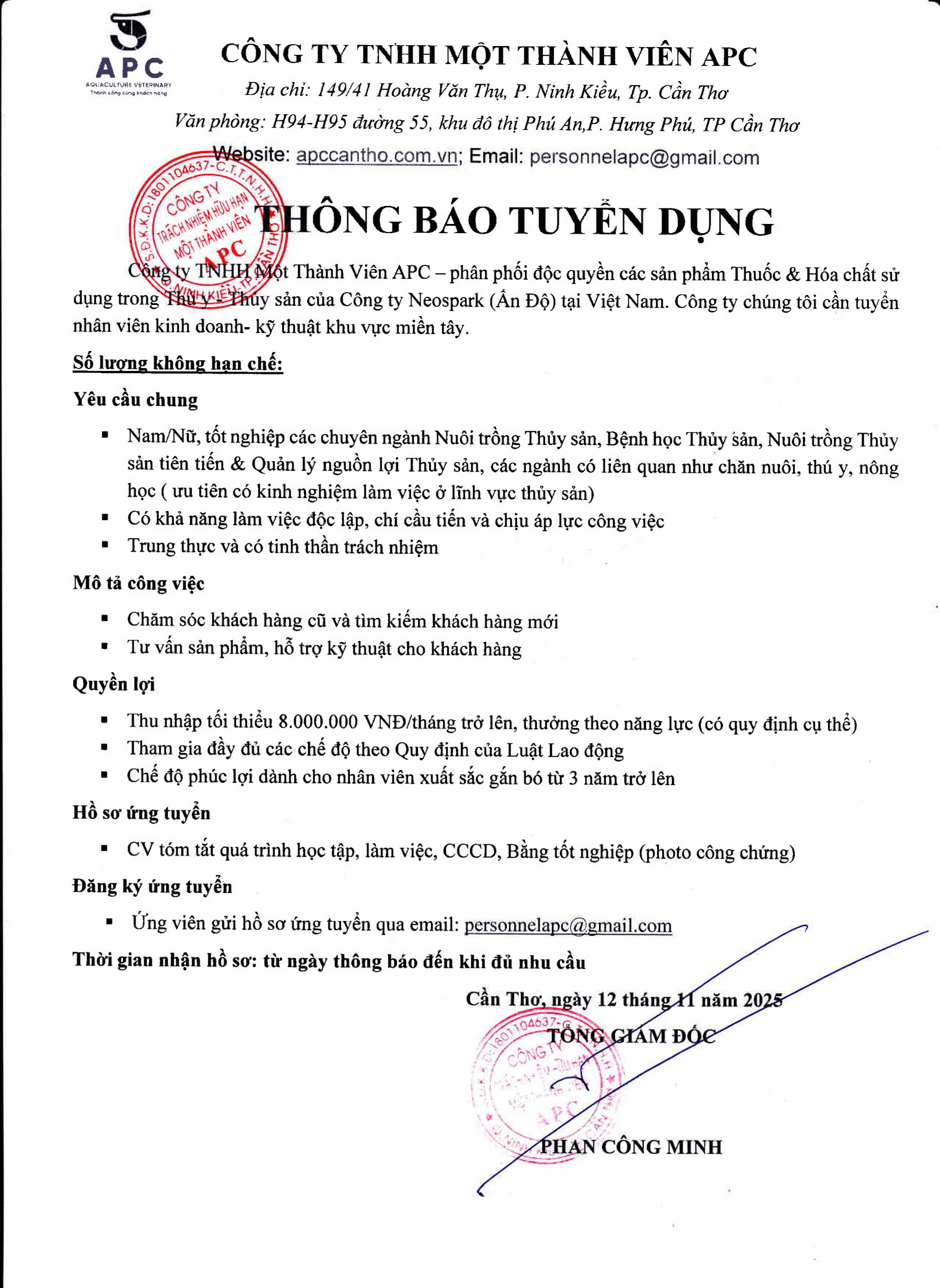- Ưu tiên ứng viên có kinh nghiệm trong lĩnh vực thủy sản.