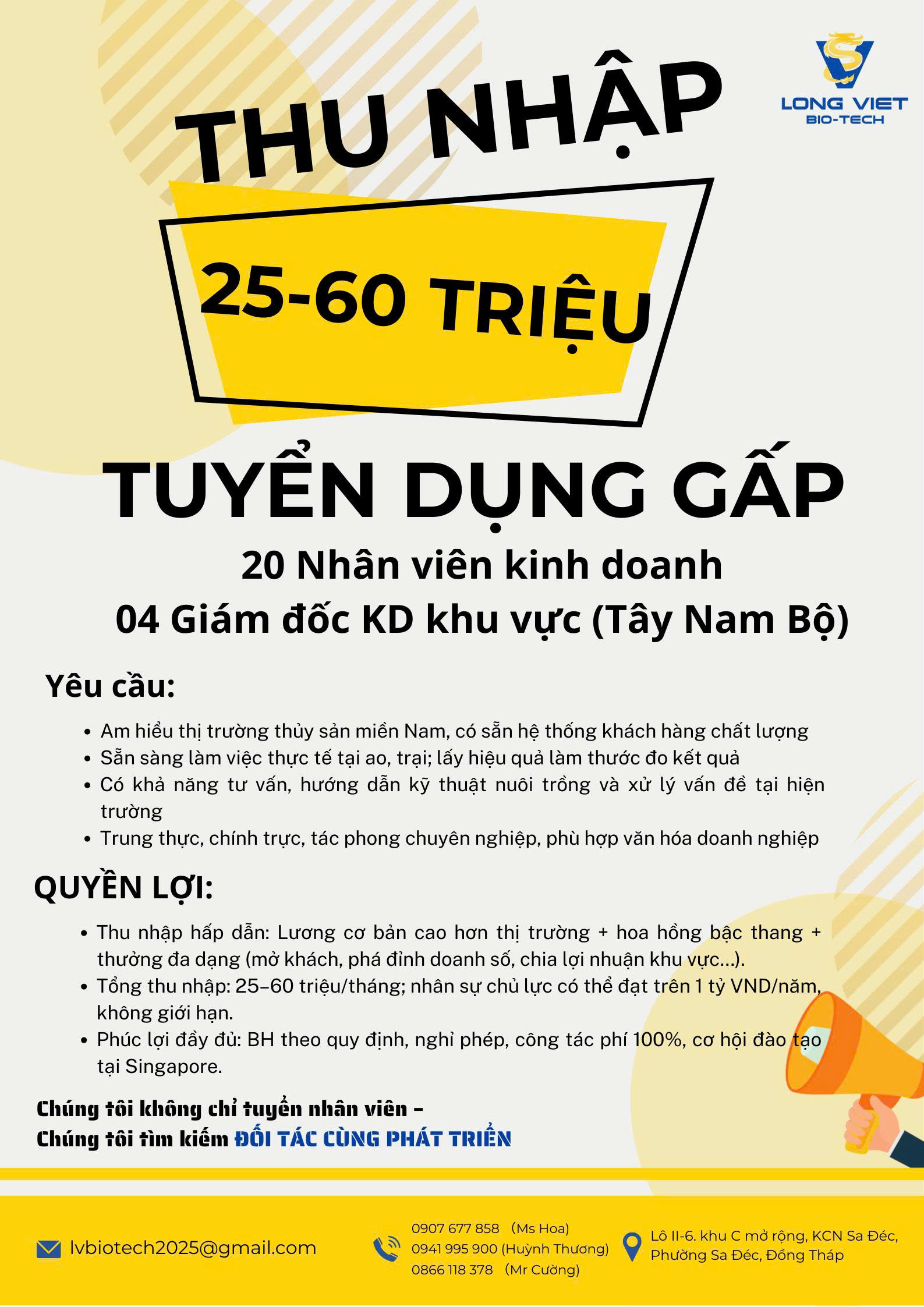 Nhằm mở rộng hoạt động kinh doanh tại khu vực Tây Nam Bộ, Long Viet Bio-Tech cần tuyển: