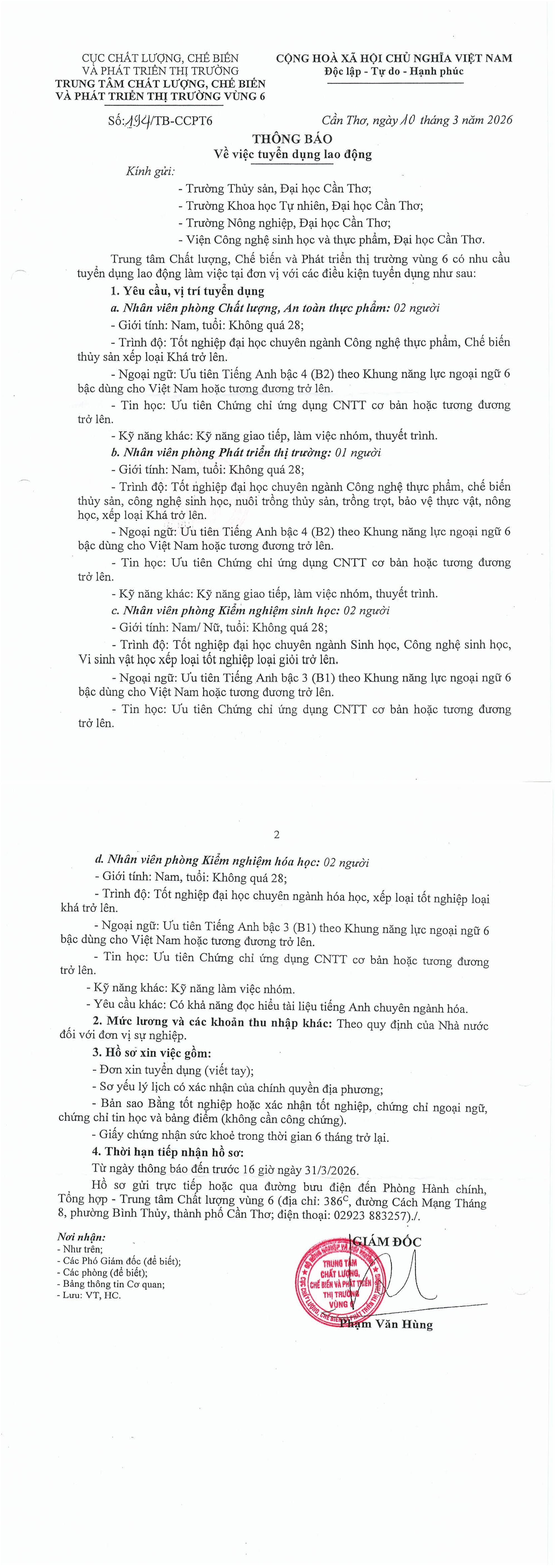 - Thời hạn: Trước 16 giờ ngày 31/03/2026. Địa điểm: Phòng Hành chính, Tổng hợp – Trung tâm Chất lượng vùng 6.