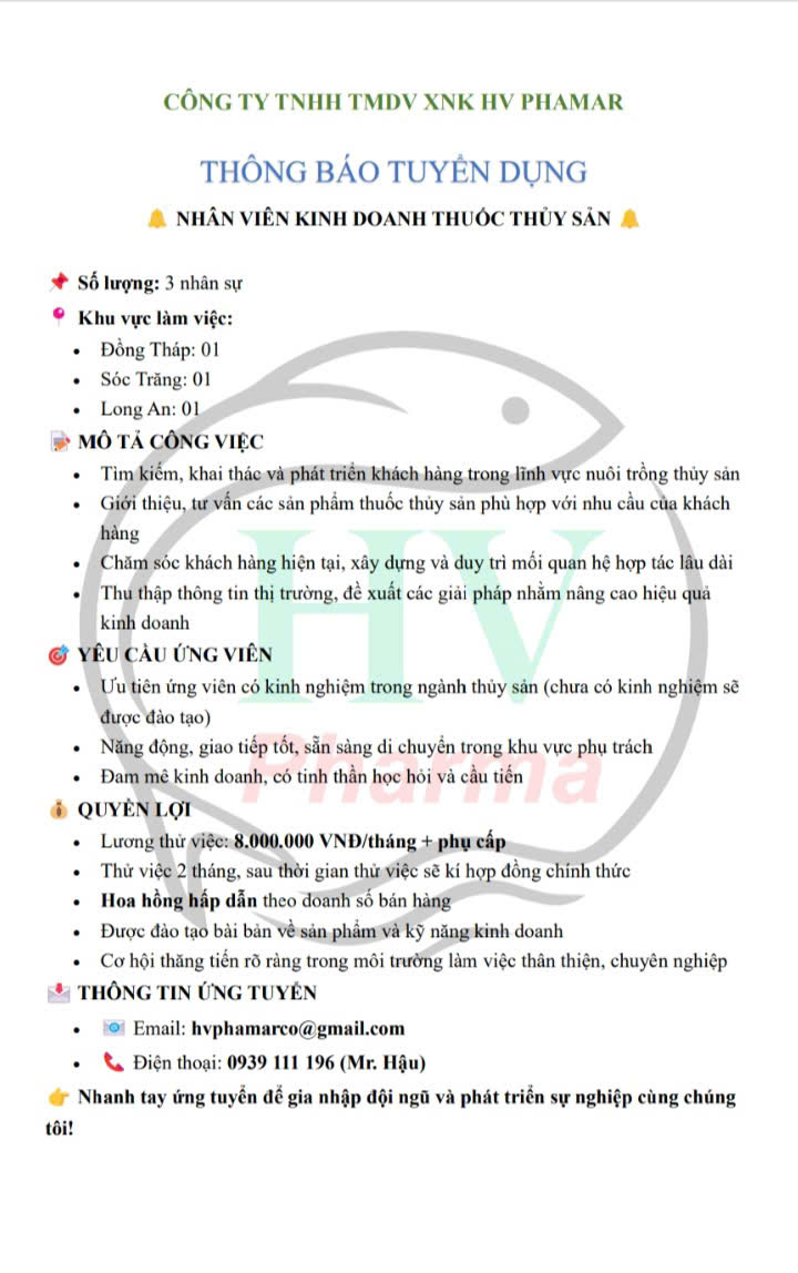 - Kinh nghiệm: Ưu tiên ứng viên có kinh nghiệm ngành thủy sản. (Chưa có kinh nghiệm sẽ được đào tạo bài bản).